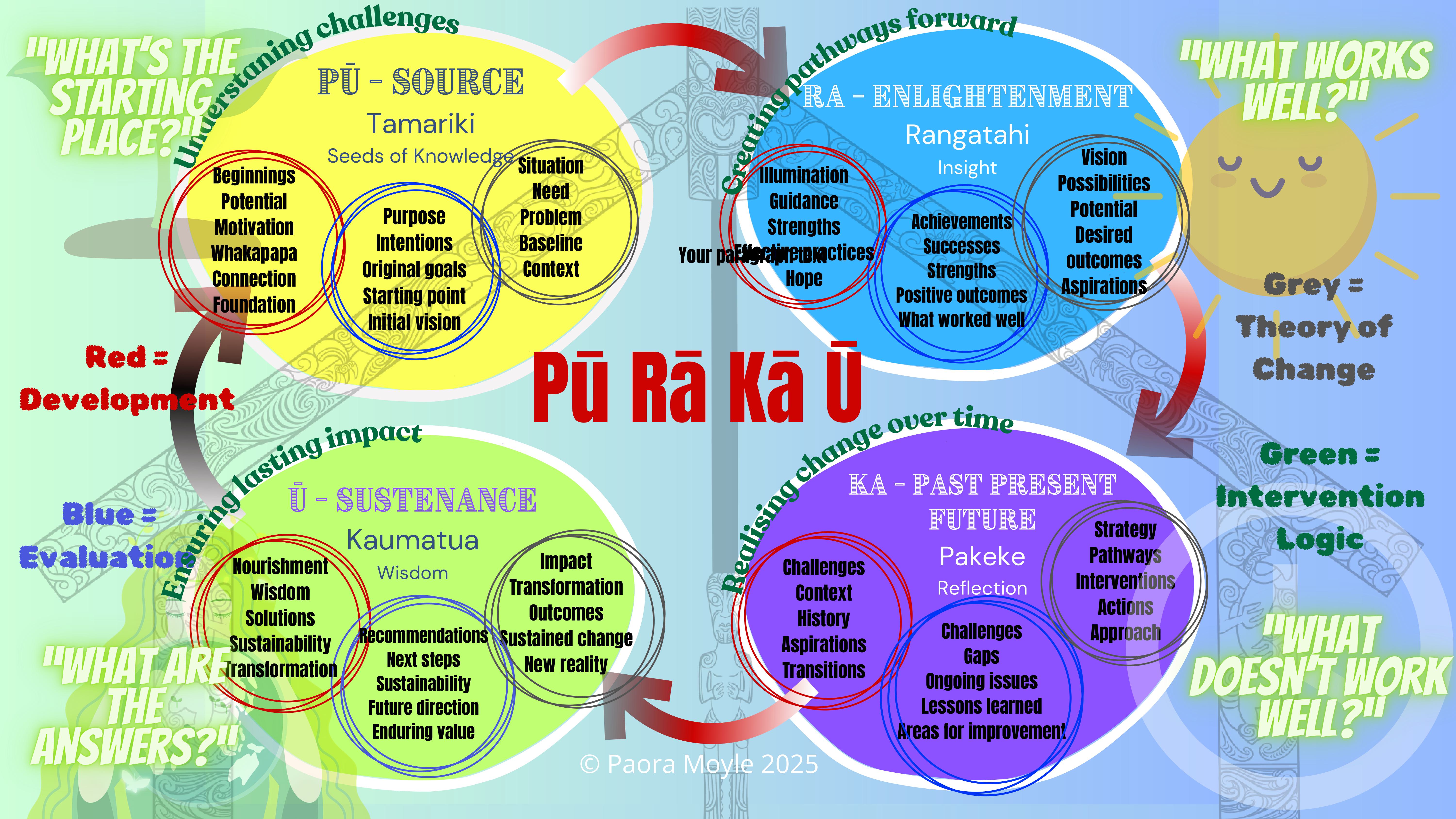 Each application answers four fundamental questions: “What’s the starting place?” (Pū), “What works well?” (Rā), “What doesn’t work well?” (Ka), and “What are the answers?” (Ū).